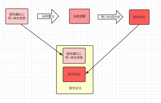 消息摘要,hash算法加密的消息摘要是不可逆的,可以防止被中间人修改。然后消息摘要还需要通过专门的认证中心(CA)用私钥加密形成一个数字签名。