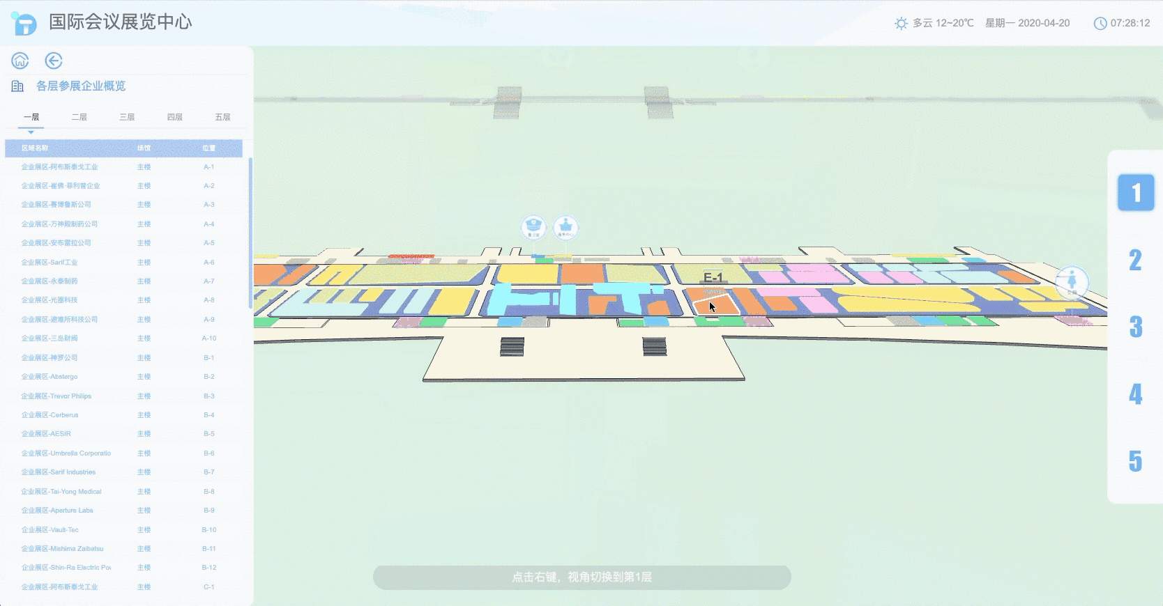 因为整体的楼层比较大,而每个楼层中可选择的展区又比较小,所以这里我做了一个视角调整,可以使用单独移动视角到正视相应楼层的视角 flyTo,这里除了采用右侧边栏选中移动,也做了鼠标移入相应楼层右键改变视角的处理,使用了新建的类 messageView 做交互提示。