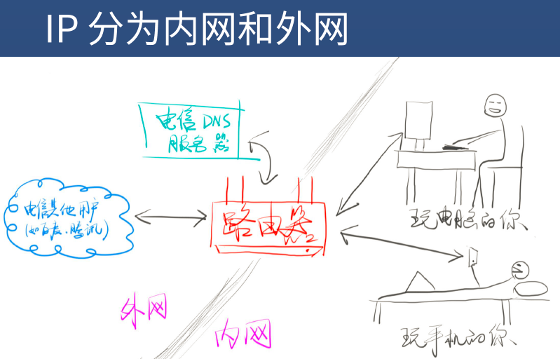 - 然后路由会给每一个内网的设备分配一个不同的内网IP,如电脑192.168.1.2,手机是192.168.1.3,以此类推