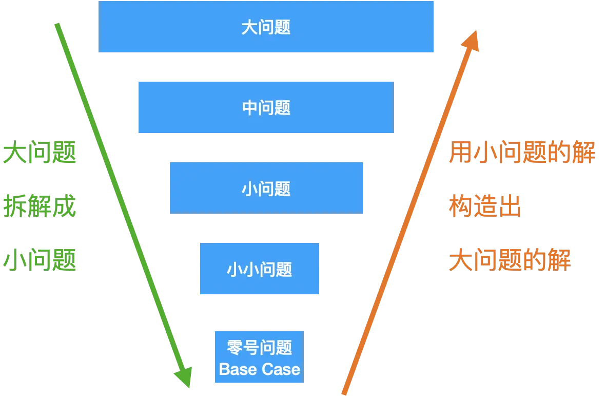 Recursion 是从大到小,层层分解,直到 base case 分解不了了再组合返回上去;
