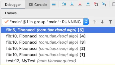 我们在 IDE 里 debug 就可以看到栈里面的情况:这里确实是先走的最左边这条线路,一共有 5 层,然后再一层层往上返回。