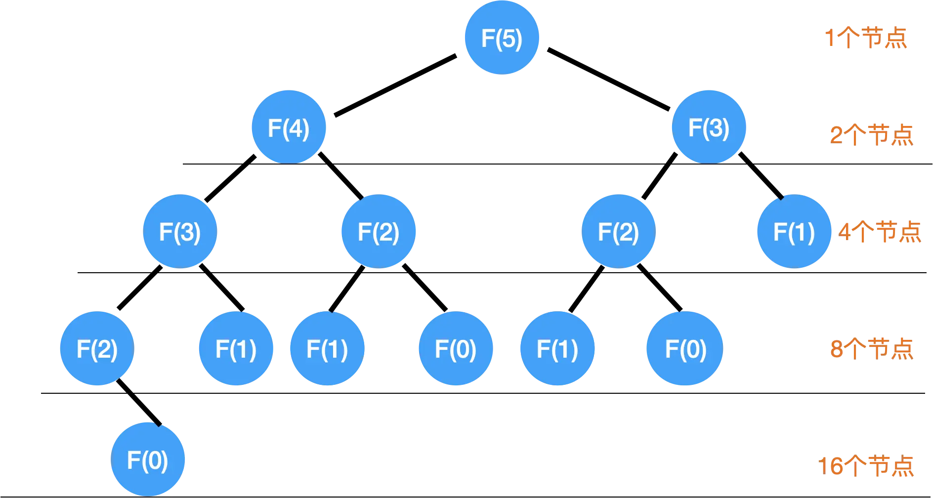 首先我们把这颗 Recursion Tree 画出来,比如我们把 F(5) 的递归树画出来: