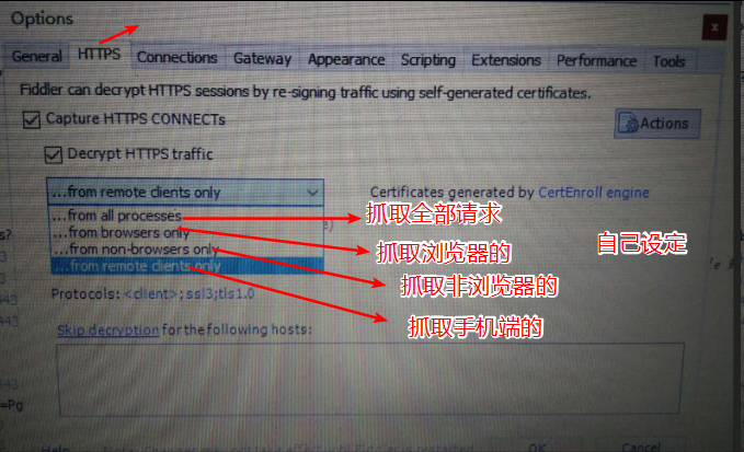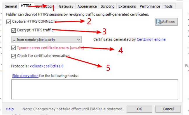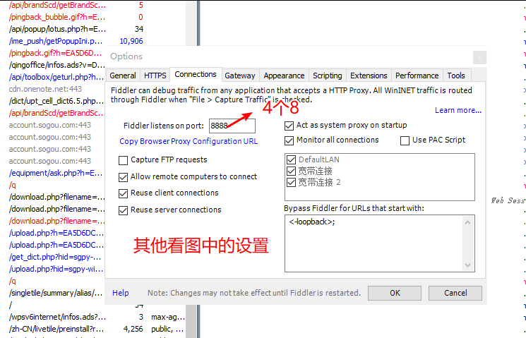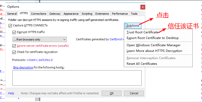 Fiddler的配置使用 大石头的笔记 2020-04-27 346 阅读1分钟 Fiddler的配置使用介绍:Fiddler是一款强大Web调试工具,它能记录所有客户端和服务器的HTTP,HTTPS请求,Fiddler是window平台的工具。下载安装:下载安装Fiddler4.0配置使用:1.打开fiddler:点击Tools---->Options会跳出一个窗口接着设置抓取对象:设置信任证书:选择完成之后,会依次出现三个窗口,选择 ----- yes,是 , 确定设置连接:最后点击OK,重启fiddler谷歌浏览器中配置:设置--->高级----> 打开代理设置------>局域网设置------>高级登录谷歌,访问百度(注意:之前装有谷歌访问助手的话,把代理给禁了,不然抓不到请求)手机抓包:在“代理”后面的输入框选择“手动”,在“代理服务器主机名”后面的输入框输入电脑的ip地址,在“代理服务器端口”后面的输入框输入8888,然后点击“保存”按钮。上面的步骤做玩之后,Fiddler的配置都算完成了。更多免费技术资料可关注:annalin1203