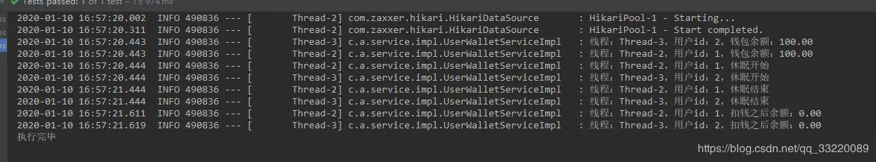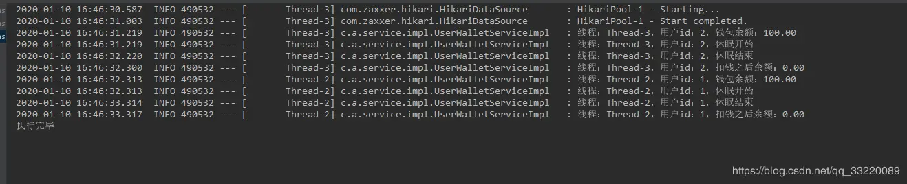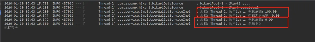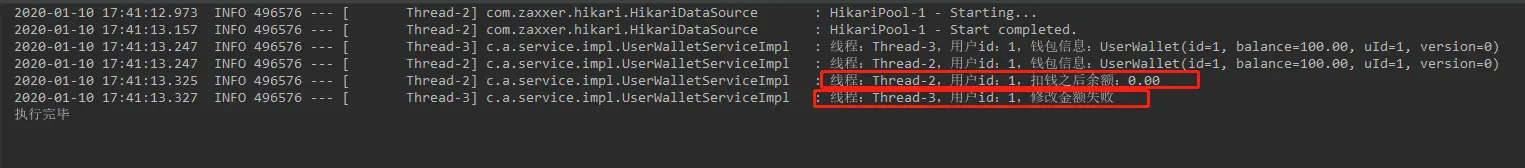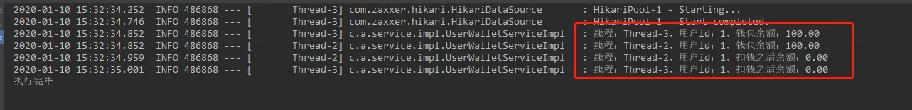 log.info("线程:{},用户id:{},扣钱之后余额:{}", threadName, userId, wallet.getBalance());