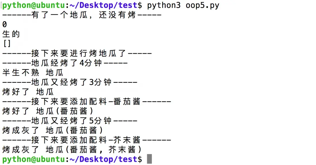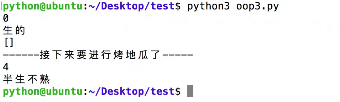 1 2 3 4 | print("------接下来要进行烤地瓜了-----")mySweetPotato.cook(4) #烤4分钟print(mySweetPotato.cookedLevel)print(mySweetPotato.cookedString) |