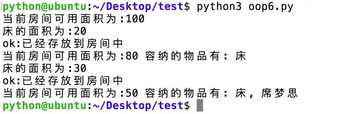 01 02 03 04 05 06 07 08 09 10 11 12 13 14 15 16 17 18 19 20 21 22 23 24 25 26 27 28 29 30 31 32 33 34 35 36 37 38 39 40 41 42 43 44 45 46 47 48 49 50 | #定义一个home类class Home: def __init__(self, area): self.area = area #房间剩余的可用面积 #self.light = 'on' #灯默认是亮的 self.containsItem = [] def __str__(self): msg = "当前房间可用面积为:" + str(self.area) if len(self.containsItem) > 0: msg = msg + " 容纳的物品有: " for temp in self.containsItem: msg = msg + temp.getName() + ", " msg = msg.strip(", ") return msg #容纳物品 def accommodateItem(self,item): #如果可用面积大于物品的占用面积 needArea = item.getUsedArea() if self.area > needArea: self.containsItem.append(item) self.area -= needArea print("ok:已经存放到房间中") else: print("err:房间可用面积为:%d,但是当前要存放的物品需要的面积为%d"%(self.area, needArea))#定义bed类class Bed: def __init__(self,area,name = '床'): self.name = name self.area = area def __str__(self): msg = '床的面积为:' + str(self.area) return msg #获取床的占用面积 def getUsedArea(self): return self.area def getName(self): return self.name#创建一个新家对象newHome = Home(100)#100平米print(newHome)#创建一个床对象newBed = Bed(20)print(newBed)#把床安放到家里newHome.accommodateItem(newBed)print(newHome)#创建一个床对象newBed2 = Bed(30,'席梦思')print(newBed2)#把床安放到家里newHome.accommodateItem(newBed2)print(newHome) |