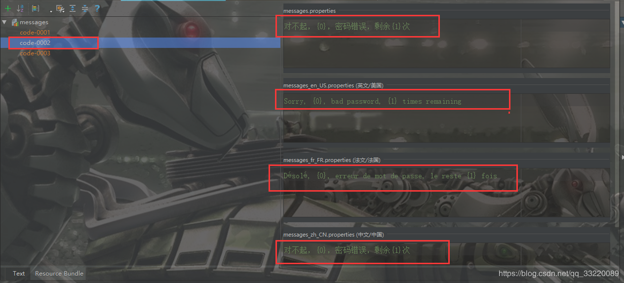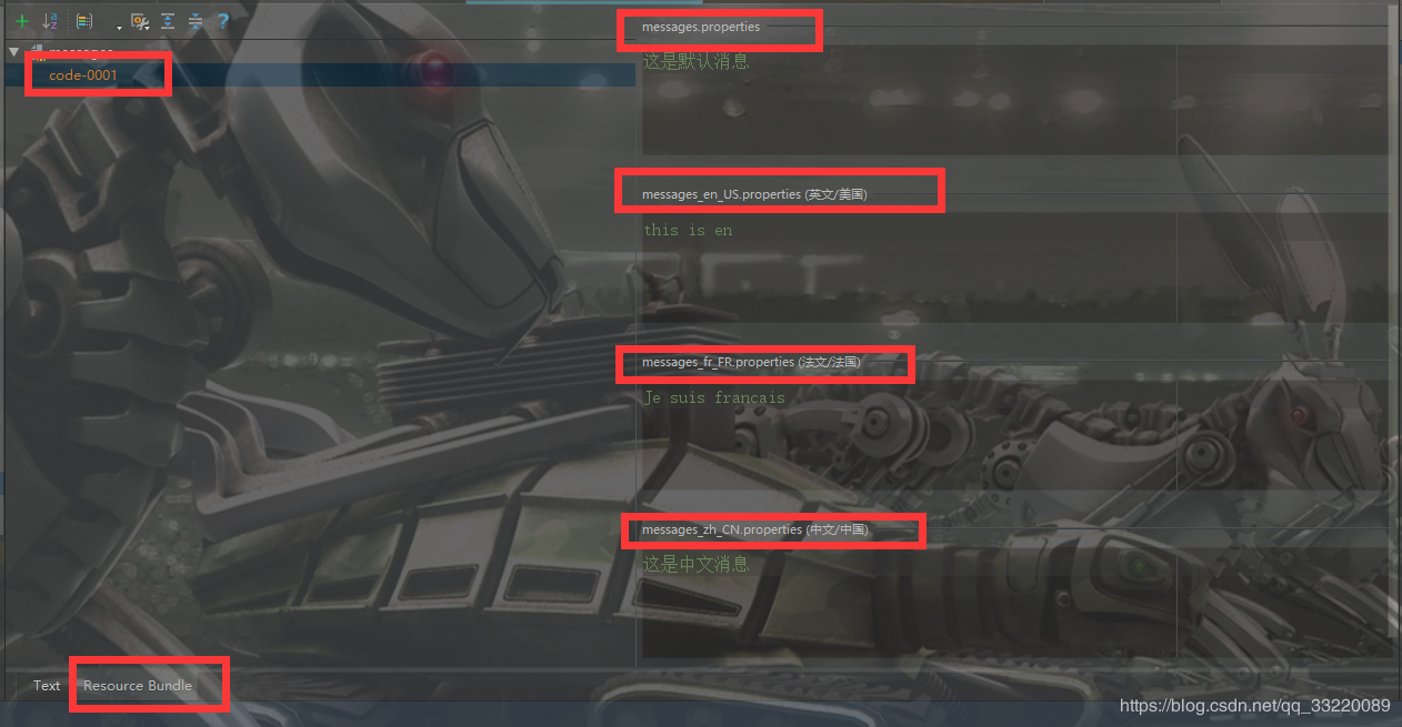 不知道你有没有发现messageSource.setBasename("i18n/messages");这行代码,很重要,i18n表示你们文件目录,messages表示你配置文件的前缀,比如我的:messages_en_US.properties、messages_zh_CN.properties、messages_fr_FR.properties、messages.properties。