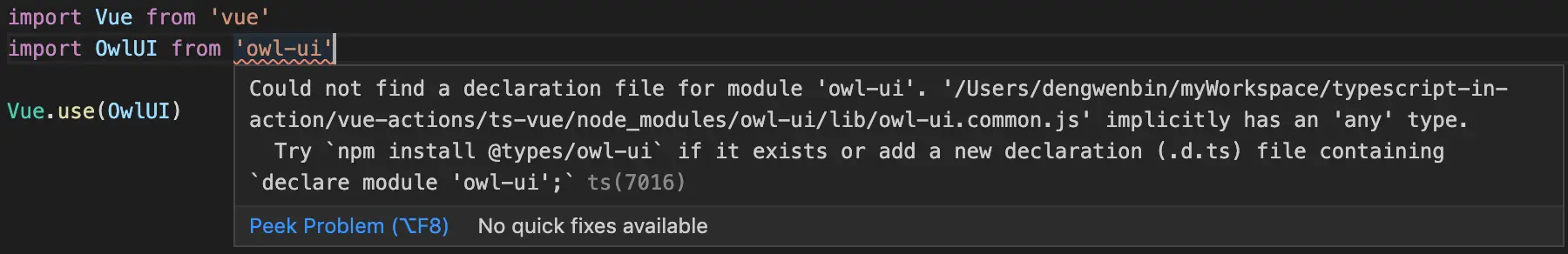 找不到 owl-ui 模块的声明文件,请尝试执行 npm install @types/owl-ui 添加声明文件,或者创建一个包含 declare module 'owl-ui' 的 .d.ts 文件. 编译器为开发者提供了两种解决办法,这两种办法在后面会介绍给大家,在这之前我简单介绍一下声明文件.