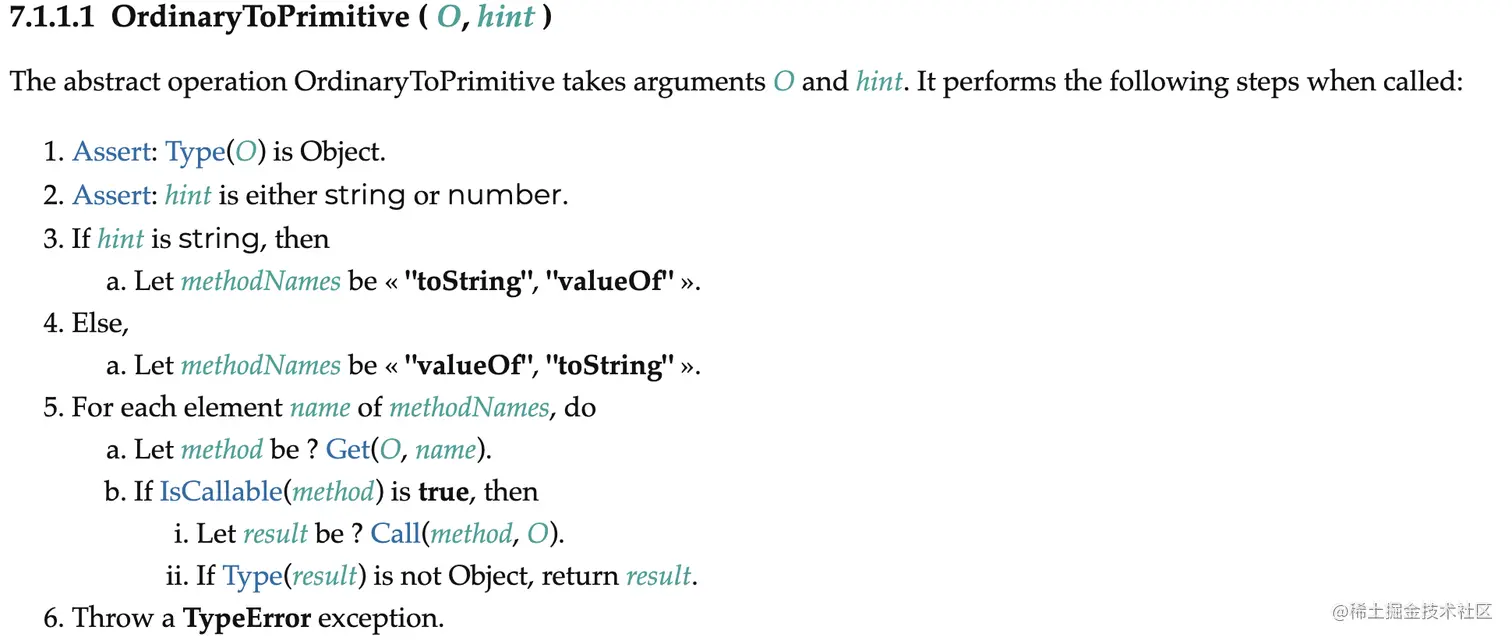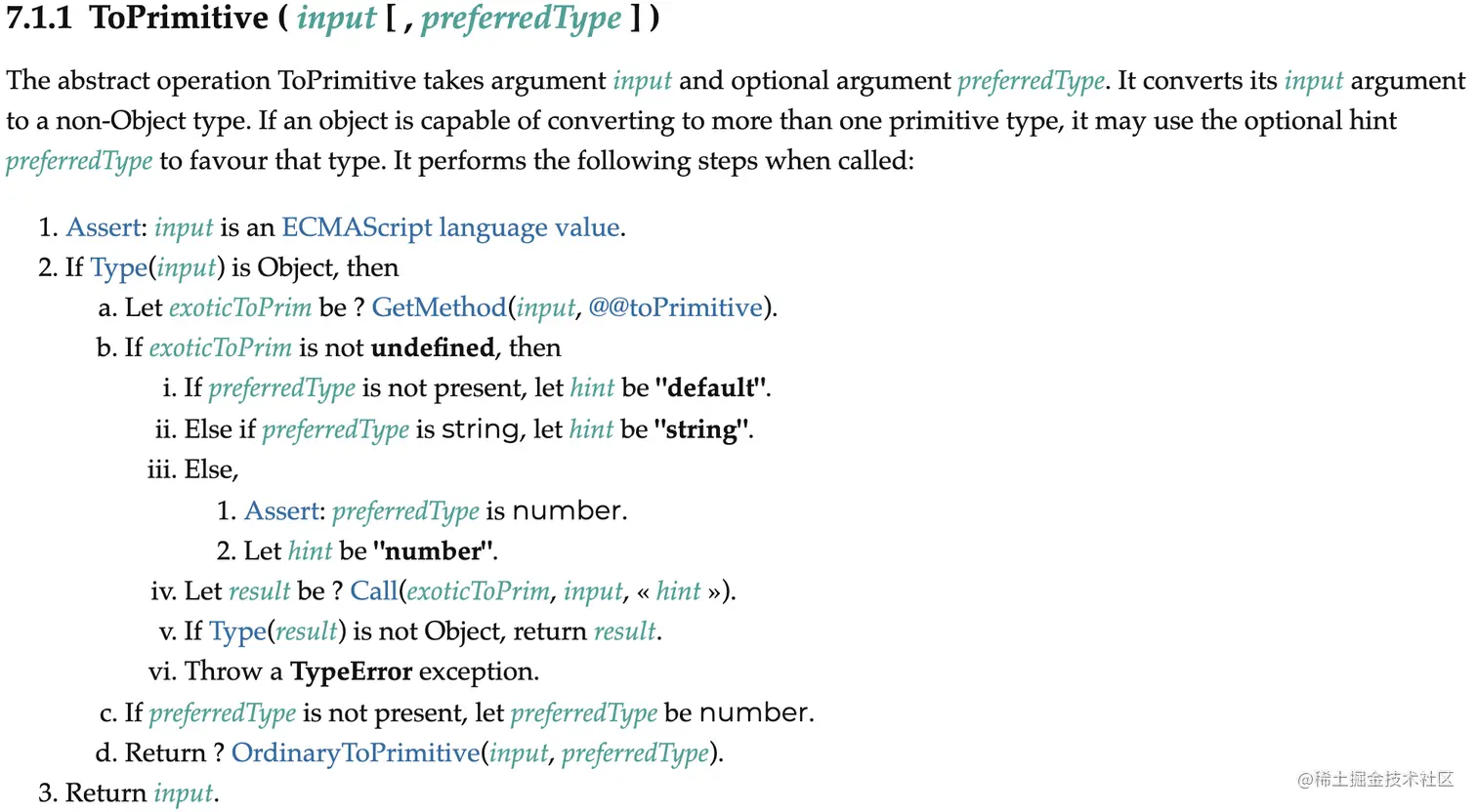 而这一切,在 ECMAScript Language Specification - 7.1.1 ToPrimitive 中早有定义,它指明了 JavaScript 引擎是如何按照步骤把 object 转换为 primitive.
