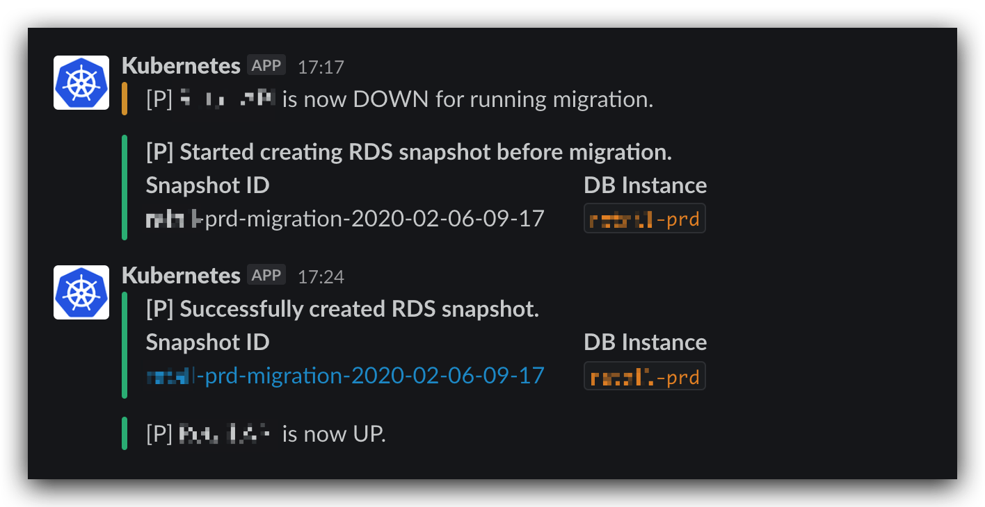 最后,我们给整个流程加上了 Slack 通知,以便于工程师们实时得知 migration 的执行状况: