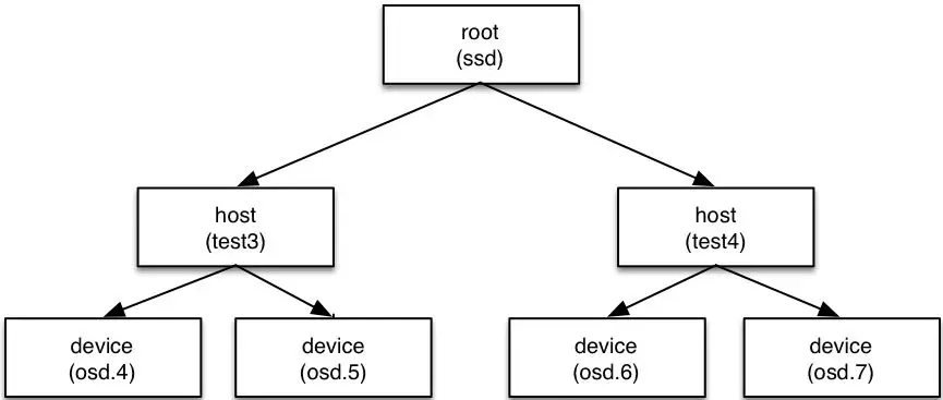 叶子节点是device(也就是osd),其他的节点称为bucket节点,这些bucket都是虚构的节点,可以根据物理结构进行抽象,当然树形结构只有一个最终的根节点称之为root节点,中间虚拟的bucket节点可以是数据中心抽象、机房抽象、机架抽象、主机抽象等。
