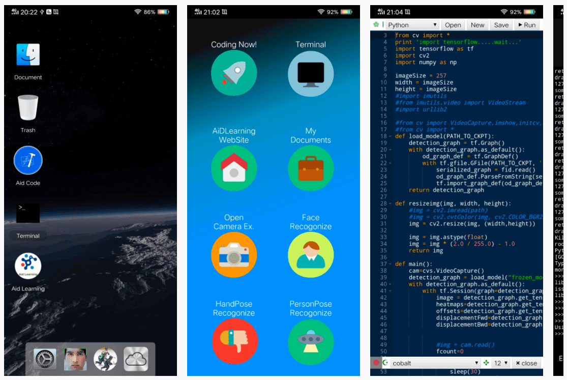 AidLearning build Linux environment running on the Android devices with GUI, Deep-Learning and Python Visual Programming support. Now support VSCode,Jupyter, pyToApk! One-click install.一个运行在移动端(Android)上的支持图形化桌面的完整的Linux虚拟机,同时是一个支持深度神经网络开发的框架和平台,内置了最为流行的深度学习框架caffe/mxnet/keras/pytoch/tensorflow/ncnn/opencv...内置了可视化AI开发编辑器,内置了VSCode、Jupyter等流行的编程工具,支持触摸拖拽式界面设计,支持代码动态调试和运行。支持在移动端和PC端用python开发你的AI应用,支持把你的python源码转化为APP(Apk)发布。支持一键式安装,只需要安装一个10M的App即可自动引导完成安装。