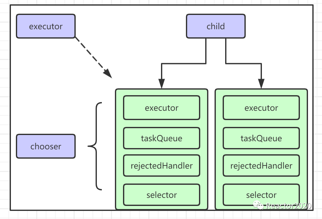 NioEventLoopGroup创建时,同时会创建三个元素: executor、chooser和 child: