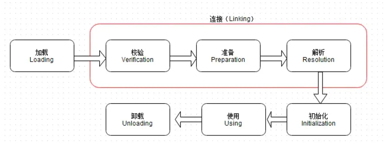 JVM类加载机制分为五个部分:加载,验证,准备,解析,初始化,下面我们就分别来看一下这五个过程。其中加载、检验、准备、初始化和卸载这个五个阶段的顺序是固定的,而解析则未必。为了支持动态绑定,解析这个过程可以发生在初始化阶段之后。
