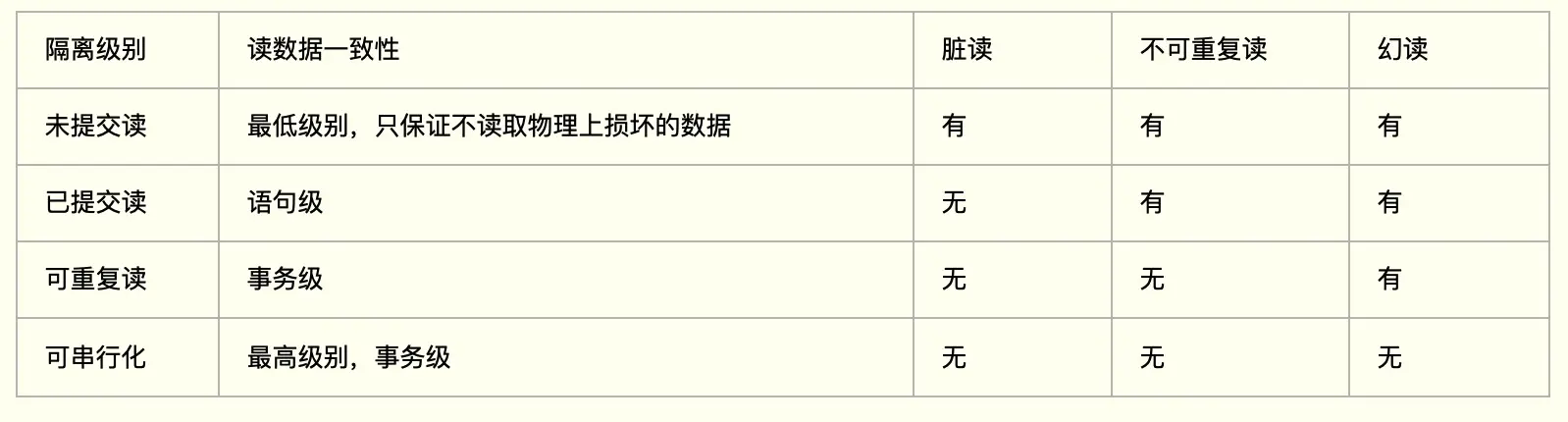 - SERIALIZABLE(序列化): 在该隔离级别下事务都是串行顺序执行的,MySQL 数据库的 InnoDB 引擎会给读操作隐式加一把读共享锁,从而避免了脏读、不可重读复读和幻读问题。