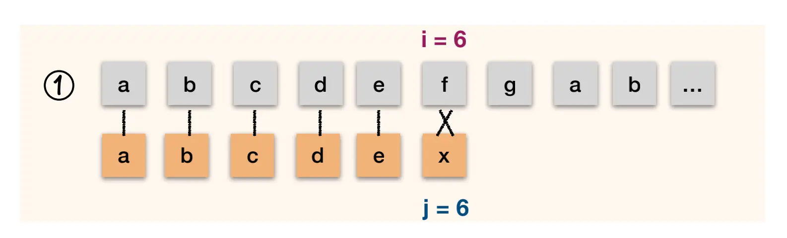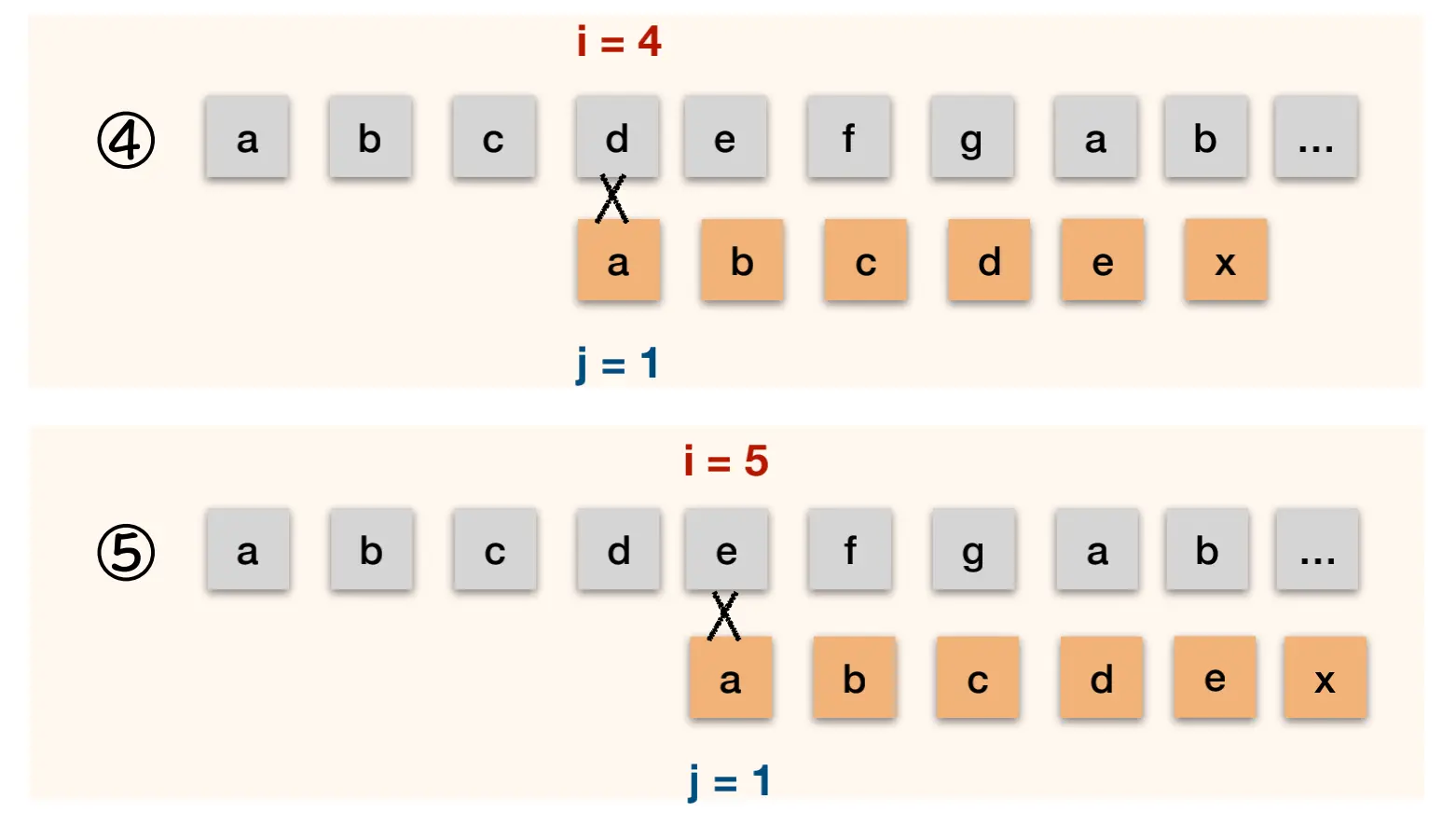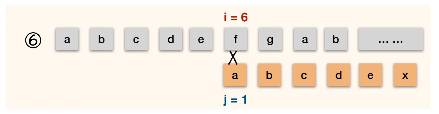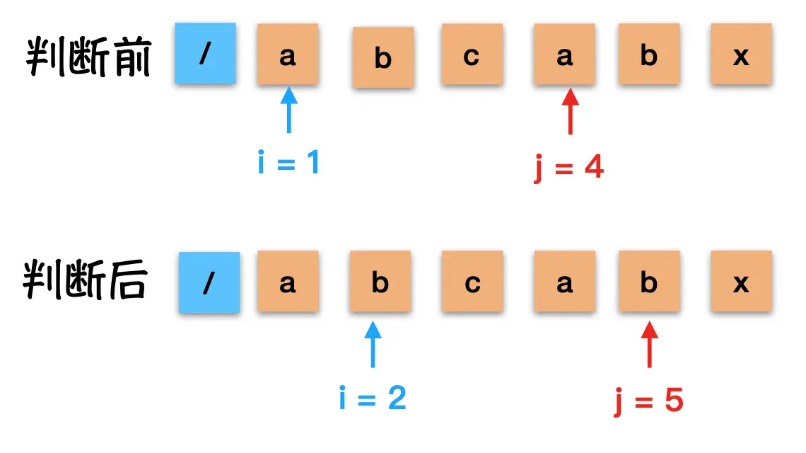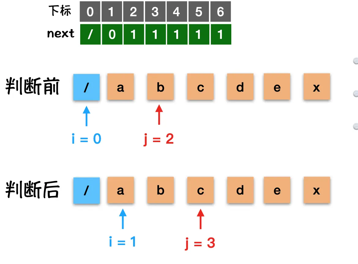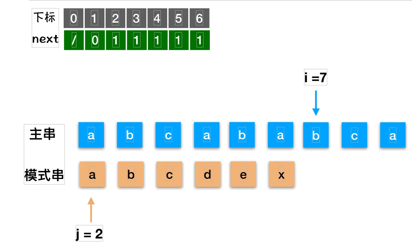 第三次 abcababca 与 abcdex 还是需要从1这个位置开始重新比较. j = next[3] = 1;