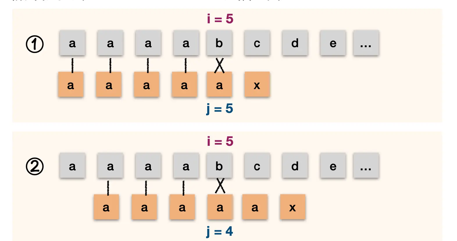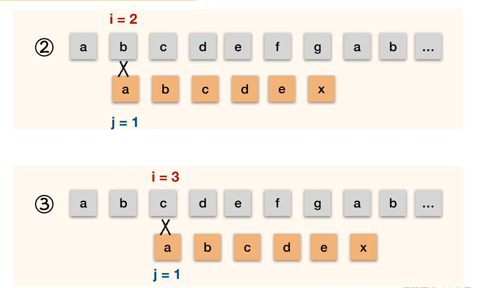 第一次 abcababcax 与 abcabx 第二次 abcababcax 与 abcabx 第三次 abcababcax 与 abcabx