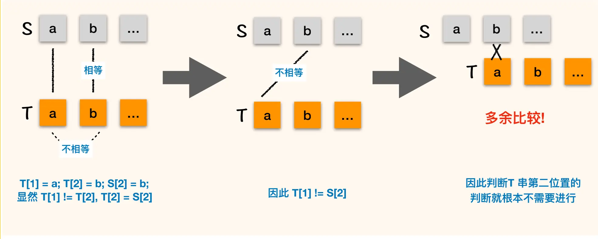 如果知道T串中的首字母“a”与T中后面的字符均不相等,并且T串的第二位“b”与S串中的第二位“b”在图1中已经判断相等。这就意味着T串中的首字符“a”与S串中的第二位“b”是不需要判断的,也知道其是不可能相等,这样以来图2便可以省了。