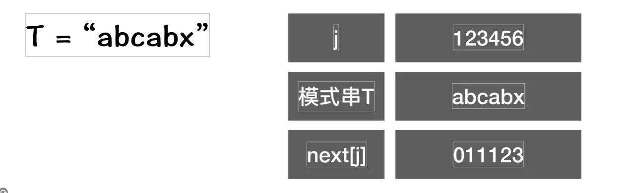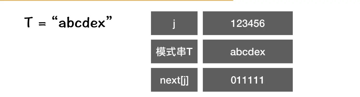 假设,主串S=“abcababca”;模式串T=“abcdex”