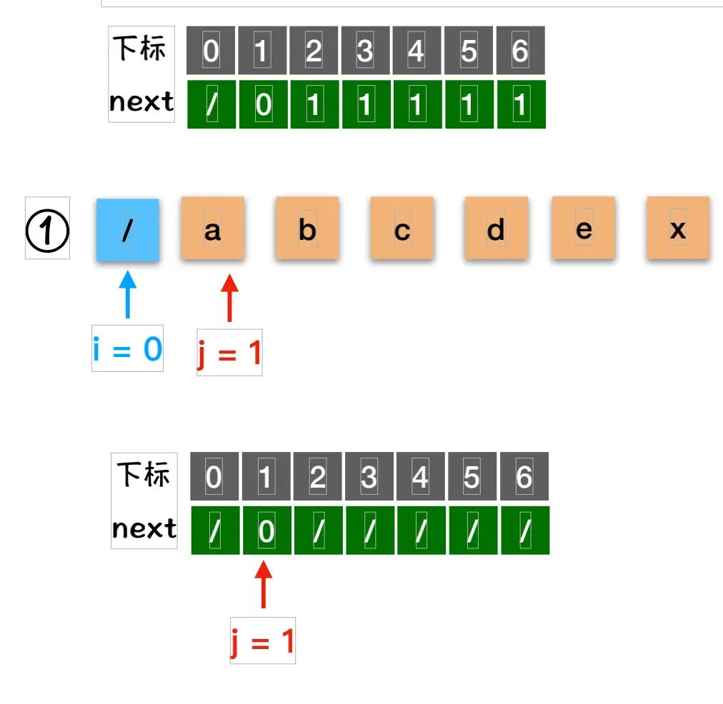 - 如果当i=0表示[i,j]这个范围内没有找到相同的字符,所以i要回溯到1的位置;表示next[j]=i;
