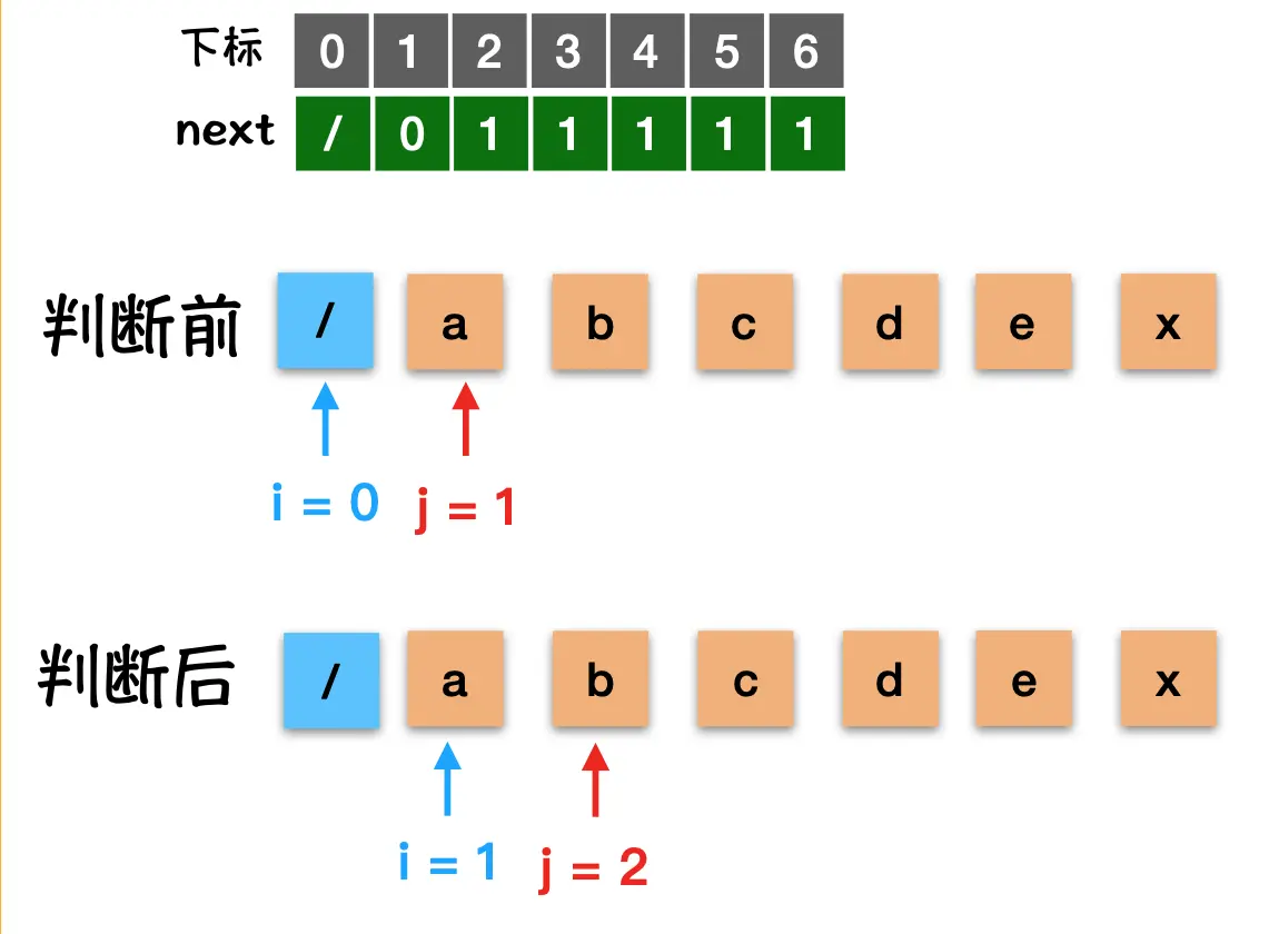 - 当 j = 0 时,表示此时你需要将模式串从1这个位置与主串i+1这个位置开始比较;