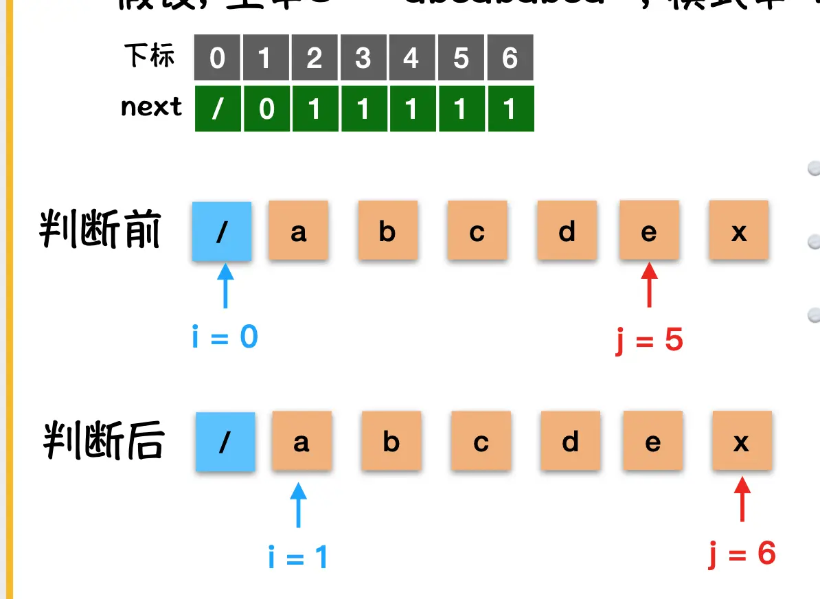 - 因为 出现 i=0, 也就是字符串串⽐比较⼜又要重头 开始,则 i++,j++; i=1, j = 4;