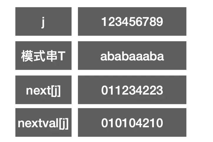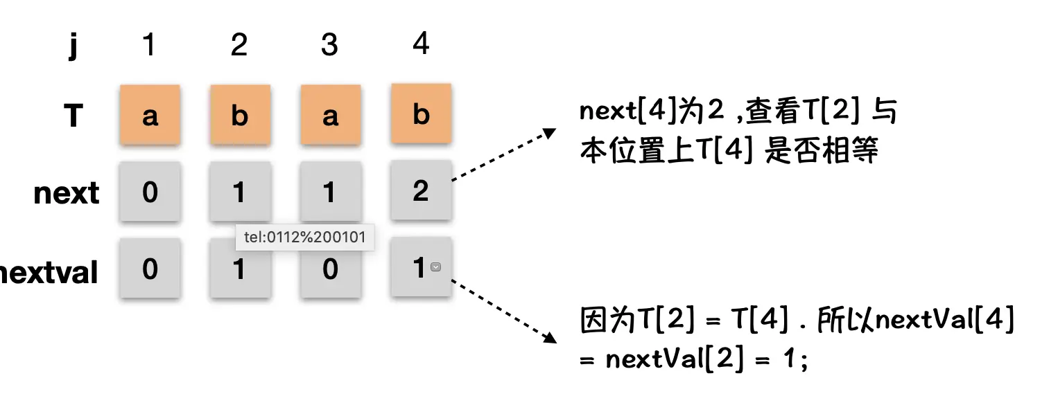 默认next[1] = 0; T[i] == T[j] 且++i,++j 后 T[i] 依旧等于 T[j] 则 nextval[i] = nextval[j]i = 0, 表示从头开始i++,j++后,且T[i] != T[j] 则nextVal = j;T[i] == T[j] 且++i,++j 后 T[i] != T[j] ,则nextVal = j;