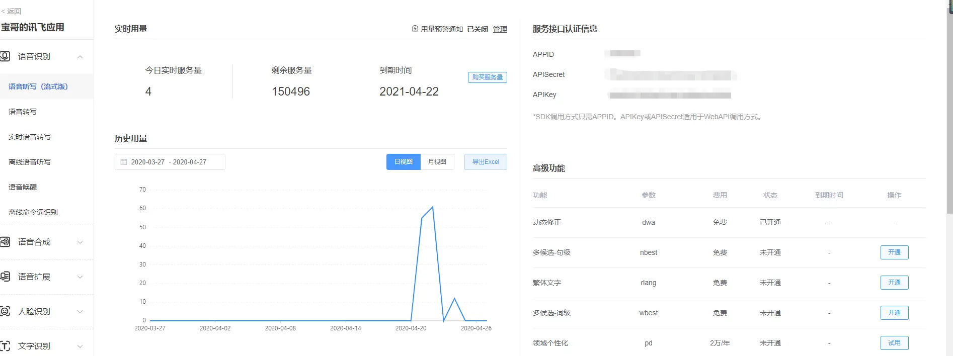 进入控制台,按照开发文档流程,建立自己的应用,选择语音听写流式版。这里可以免费使用,不过有次数限制。