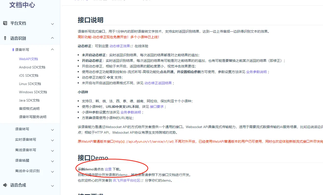 开发文档提供了相应的demo,点进去,可以看到多种语音实现的案例代码,可以直接下载,安装依赖并运行。