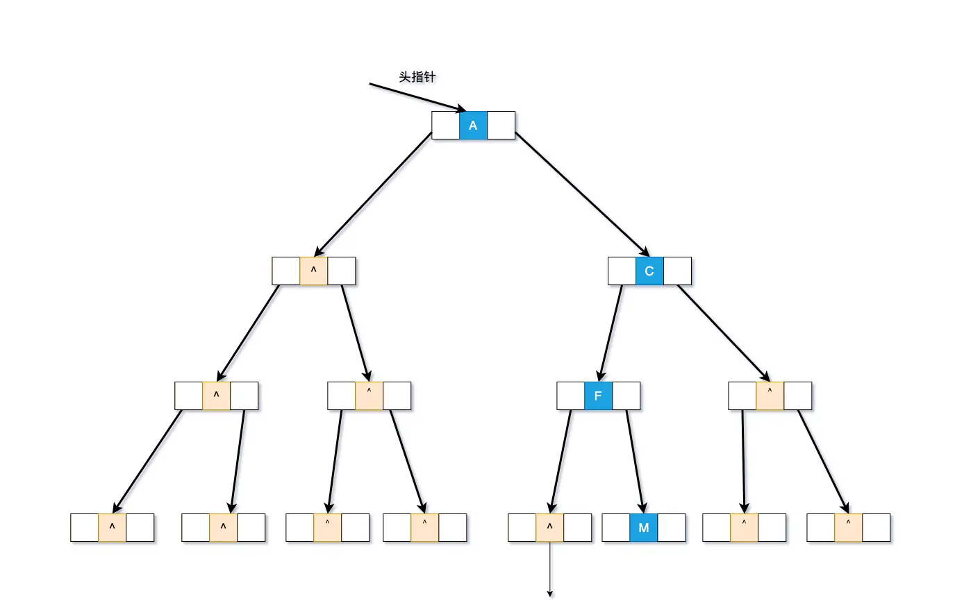 把上文中较特殊的二叉树,用这样的结点表述的二叉树结构如下:
