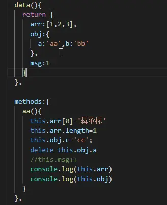 在data中写一个msg对象 执行aa方法让msg自增一 这样aa中所有的数据都会更新到视图中