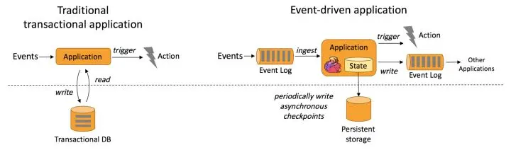 在传统架构中,我们需要读写远程事务型数据库,比如 MySQL。在事件驱动应用中数据和计算不会分离,应用只需访问本地(内存或磁盘)即可获取数据,所以具有更高的吞吐和更低的延迟。