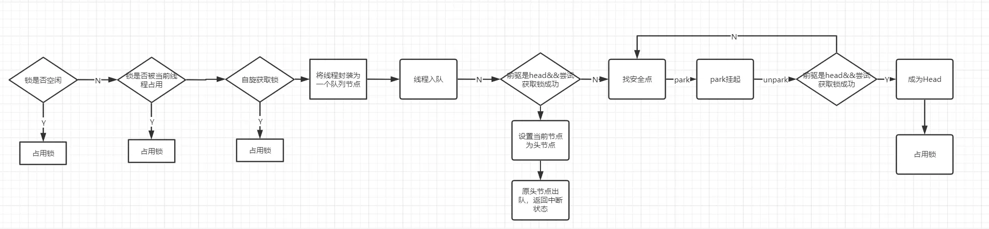 如果锁已经被获取,则将当前线程封装为AQS队列的一个节点,然后判断当前节点的前驱节点是不是HEAD节点,如果是,尝试获取锁;如果不是。则寻找一个安全点(线程状态位SIGNAL=-1的节点)。