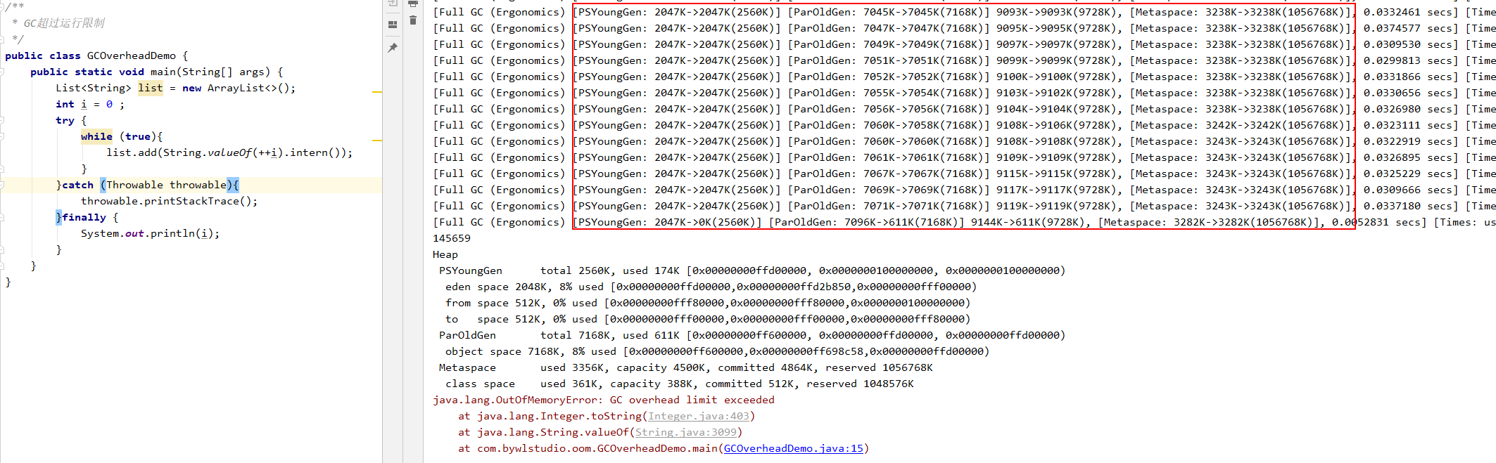 java.lang.OutOfMemoryError:overhead limit exceededGC占据了系统98%的运行,但是仅仅回收了2%不到的内存空间。导致重复GC,但空间没法释放。爆出这个错误