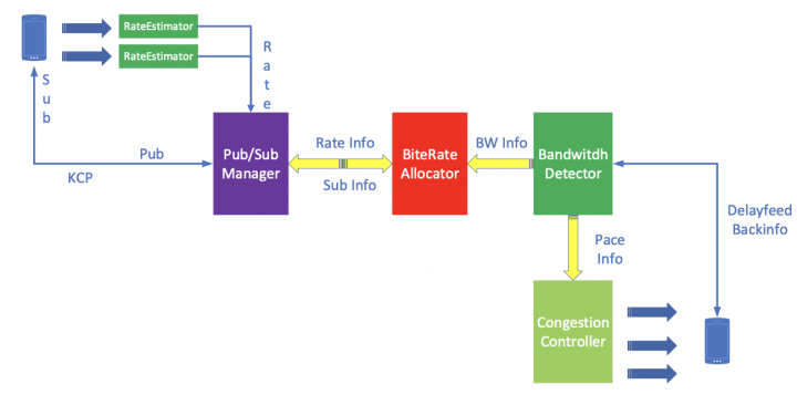 - 拥塞避免。这个模块的实现,主要是从BBR带宽探测模块获取建议的发送码率,并且严格按照码率发送,在某些场景下如真实媒体数据不足的情况,甚至可以减少发送码率。当然这些行为都能够让带宽探测模块获感知到。