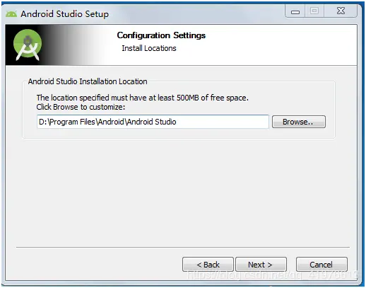 下面一步是安装路径的选择,个人建议内存大的就不要乱换了,小编这里就放在了 D:\android\android studio D:\android\android studio D:\android\android studio 文件夹自己新建就好 (说三遍,图中有误!!!!)