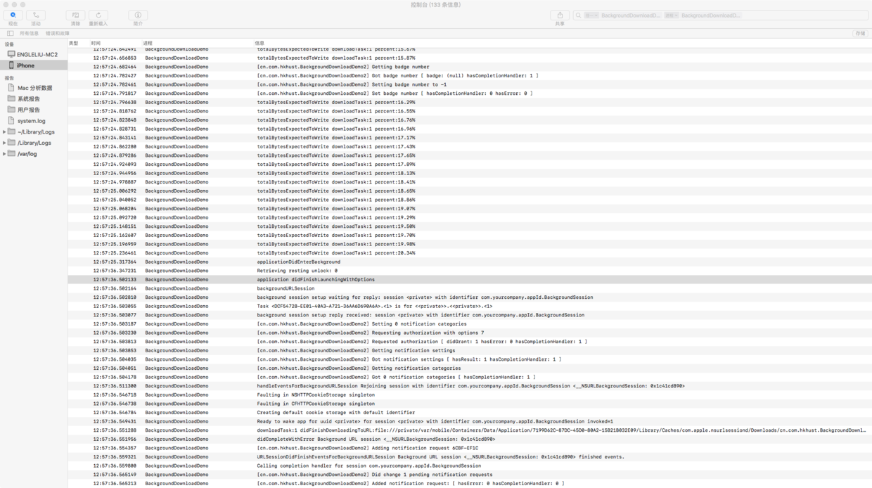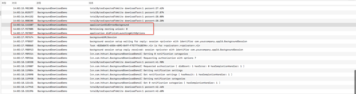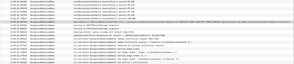 未挂起时,再进前台,会正常收到进度及完成回调,不会收到 -(void)application: handleEventsForBackgroundURLSession: completionHandler: 和 - (void)URLSessionDidFinishEventsForBackgroundURLSession::回调。