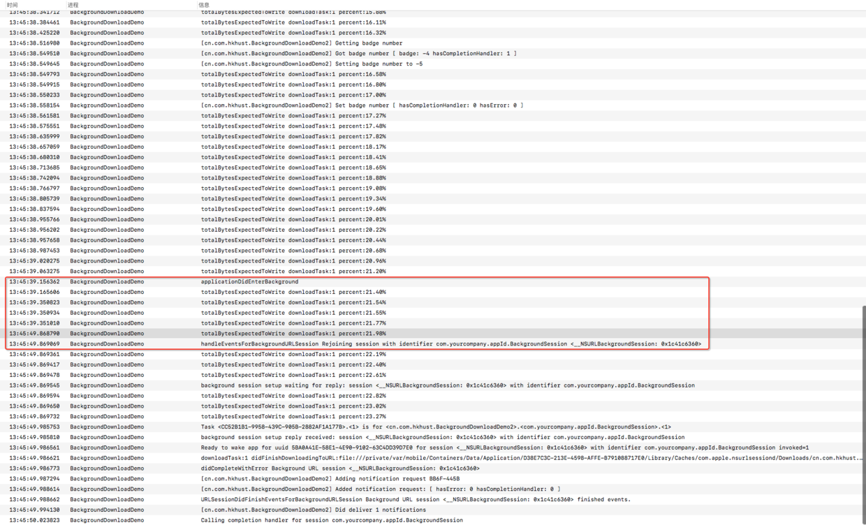 注意退后台时仍会收到一些进度回调,但是回调进度并不准确,可以用来刷新UI,所以不能当作判断依据。