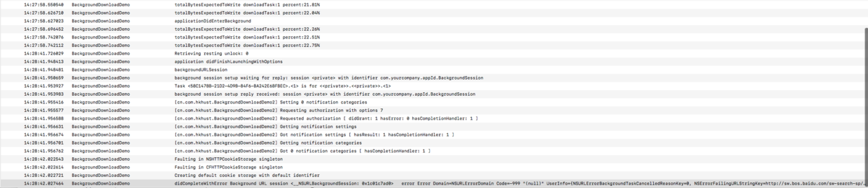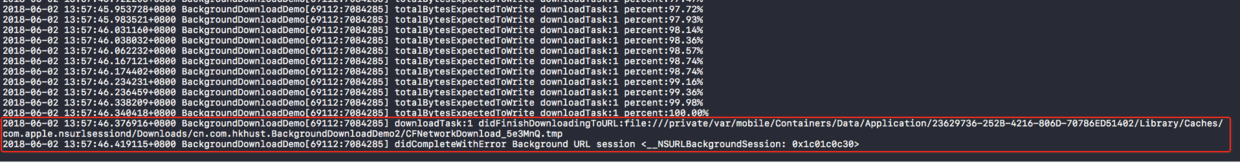 当再次唤起app时,会根据 identifier 对应的session delegate 回调 - (void)URLSession:(NSURLSession *)session task:(NSURLSessionTask *)task didCompleteWithError:(NSError *)error ,error 为 -999 失败。