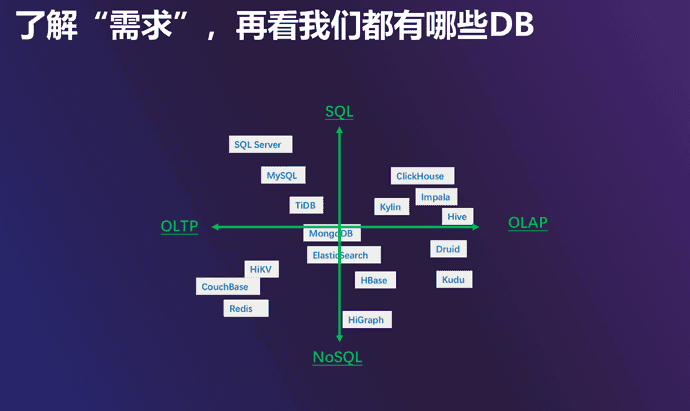 NoSQL 数据库,是一类针对特殊场景做优化的系统,schema 一般比较简单,吞吐量较高、延迟较低,一般用作缓存或者 KV 数据库。OLAP 大数据分析系统,包括 Clickhouse、Impala 等,一般支持 SQL、不支持事务,扩展性比较好,可以通过加机器增加数据的存储量,响应延迟较长。