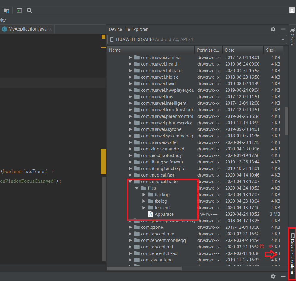 步骤2: 运行完测试代码后,我们点开studio右下角的Device Explorer,在下图的“第一步”,打开之后我们要找到我们生成的trace文件,路径在sdcard/Android/data/项目包名/files,如图: