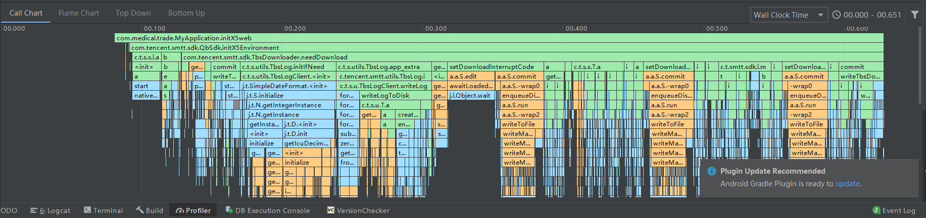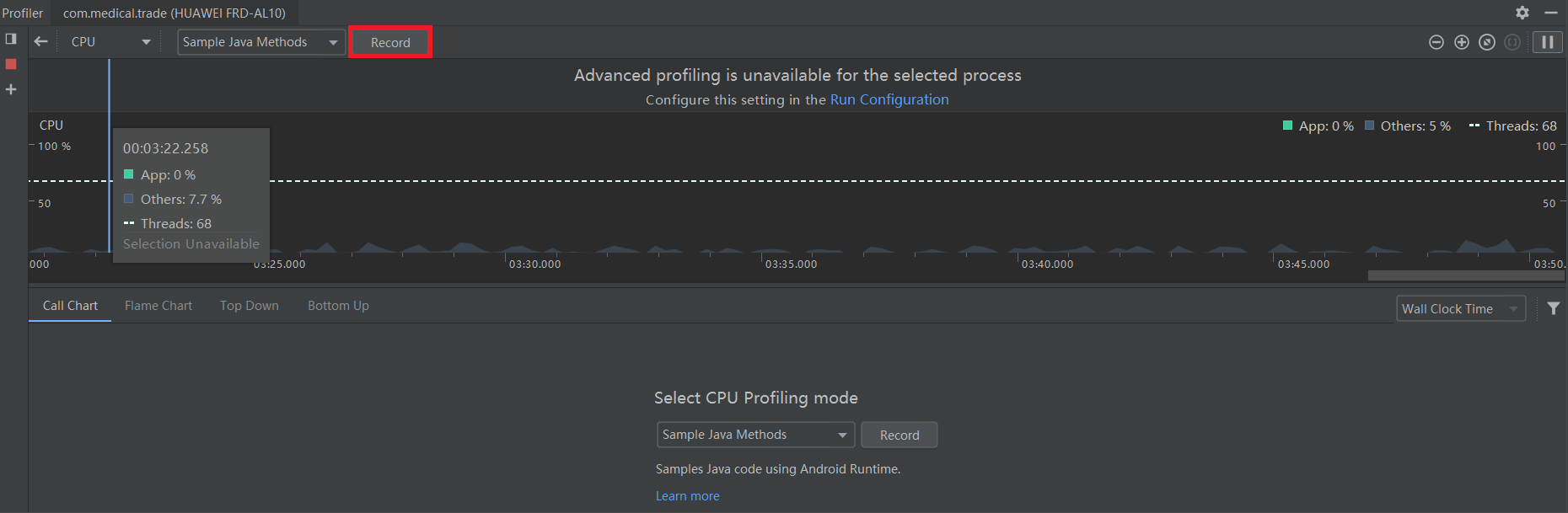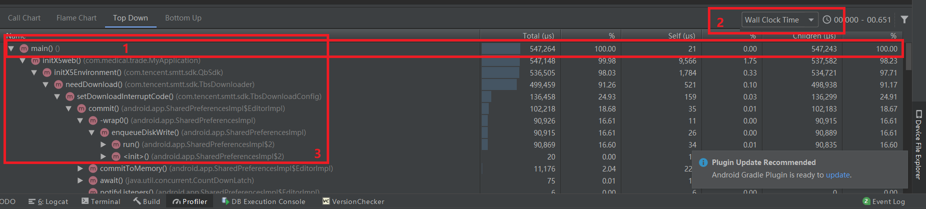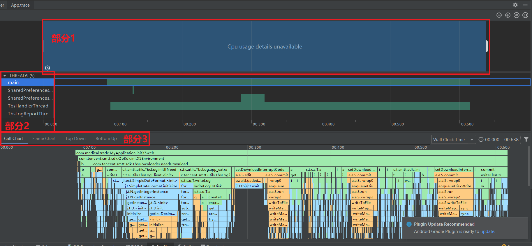 红色框2: 里面有2个选项,可以切换成Wall Clock Time或者Thread Time