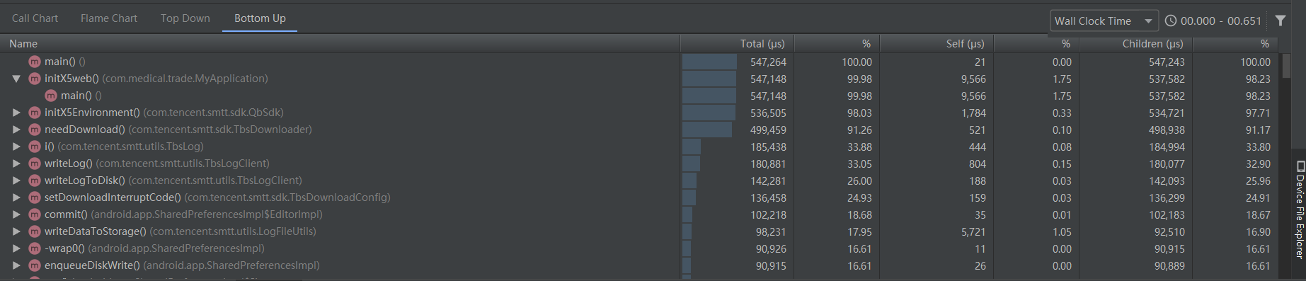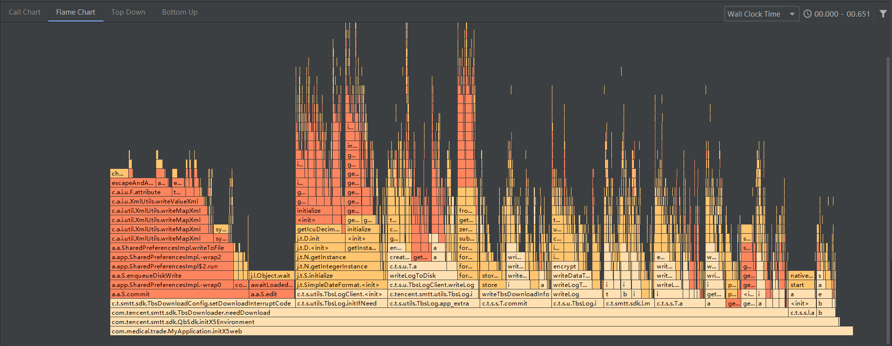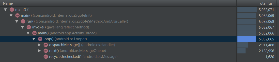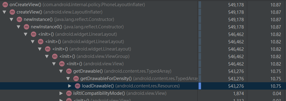 这个时候我们用第二种方式去尝试解决这个卡顿,根据我们的Top Down分析,根绝Total的耗时时间,我们一直往下点,首先来到如下(假设我们还不知道是跳转Activity卡顿):