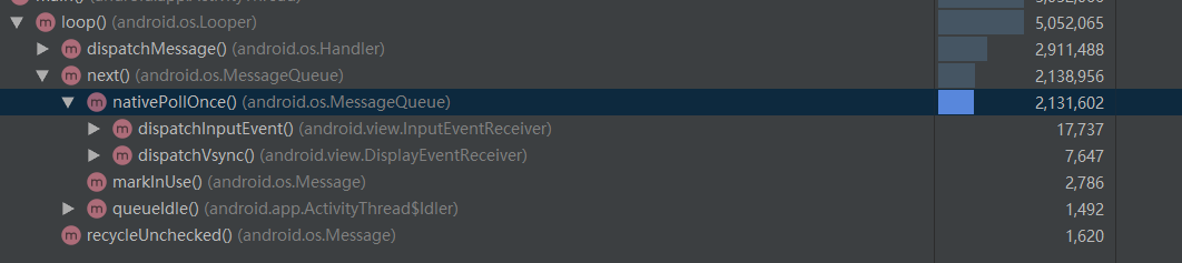 将next()点到底,如图,在nativePollOnce(),后子方法里,没有耗时项,根据方法名也能猜测到,这是系统方法。