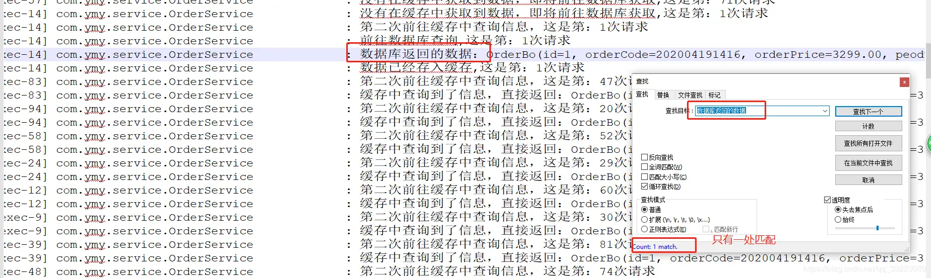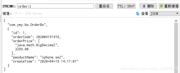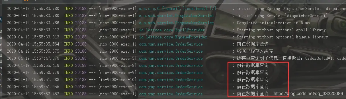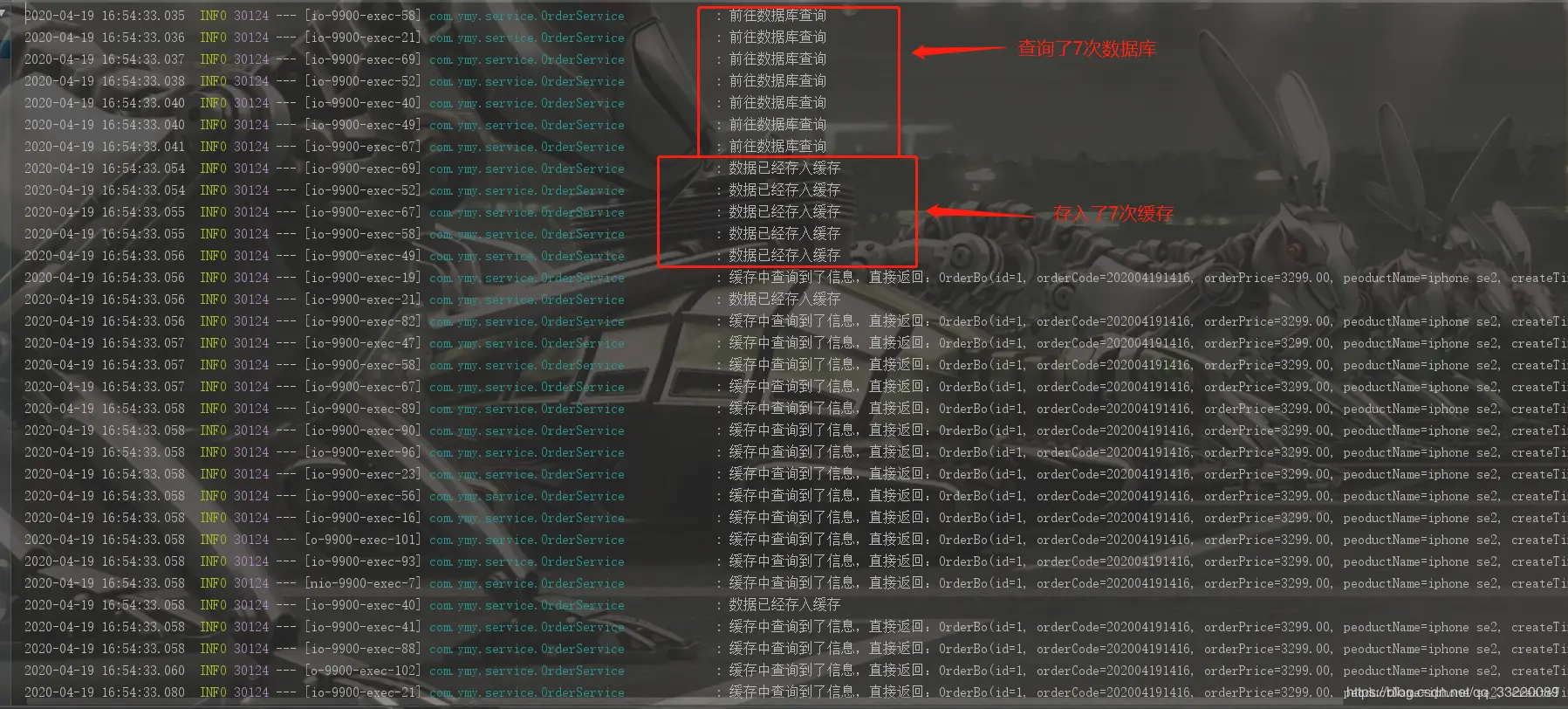 2020-04-19 15:57:47.879 INFO 20188 --- [nio-9900-exec-5] com.ymy.service.OrderService : 缓存中查询到了信息,直接返回:OrderBo(id=1, orderCode=202004191416, orderPrice=3299.00, peoductName=iphone se2, createTime=2020-04-19 14:17:07)