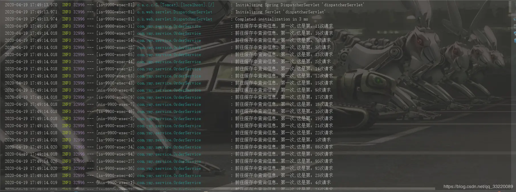 2020-04-19 15:55:35.564 INFO 20188 --- [nio-9900-exec-1] com.ymy.service.OrderService : 前往数据库查询
