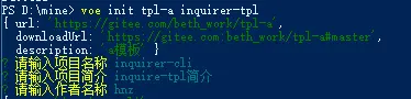 第三步,就可以下载你需要的模板啦。这里我在gitee创建的其中一个模板名为tpl-a,下载后模板命名为aaa,终端输入