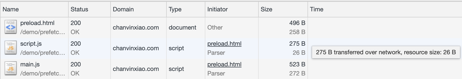 将 prefetch.html 的 link 标签的 prefetch 改为 preload,并增加资源类型 as 为 script,即得 preload.html