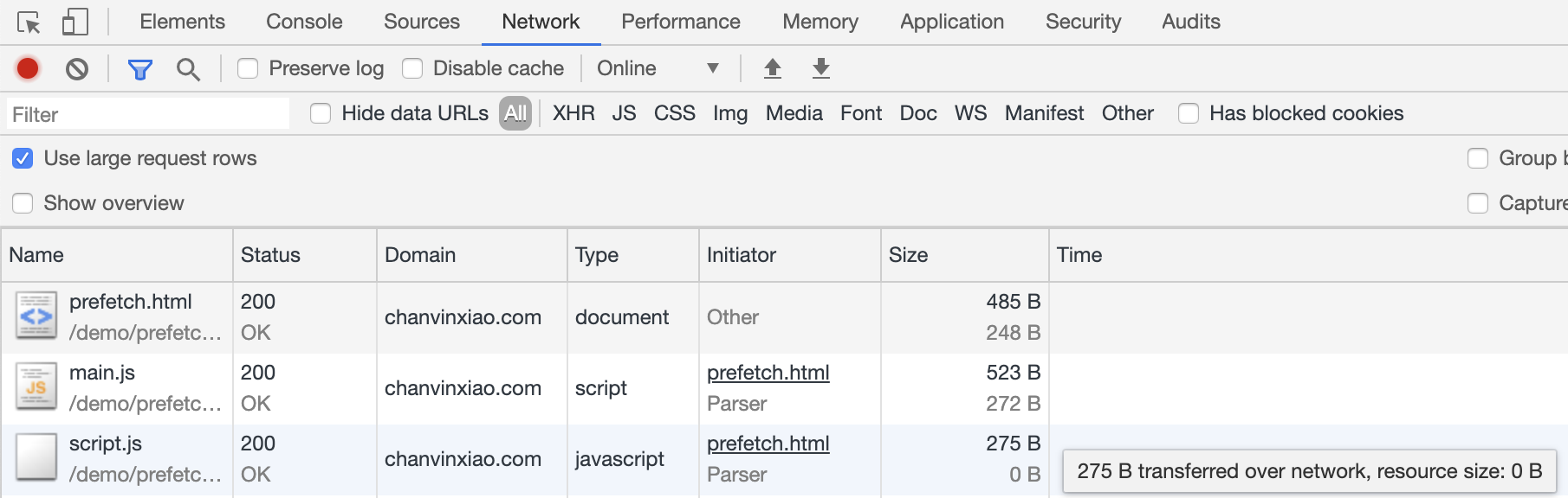 访问 http://localhost:8080 并导航至 static 中,点击 prefetch.html,或者直接访问线上页面,初始状态下,查看控制台的网络选项卡下的内容如下(不要勾选 Disable Cache,点击右侧齿轮,勾选 Use large request rows)