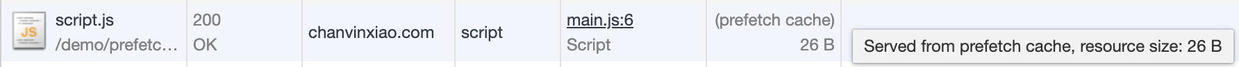 (prefetch cache),即直接从预取缓存获取资源,下面的解析后的字节不再为 0 - 控制台打印出脚本中的调试内容,即这时脚本才被解析并运行